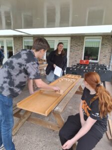 Ook hier kregen we 2 leuke spellen 1) Sjoelen met een gewone sjoelbak en sjoelen met de mega sjoelbak. 2) golven met een tennisbal. Hier werd door de jeugd goed gebruik gemaakt van de trampolines.